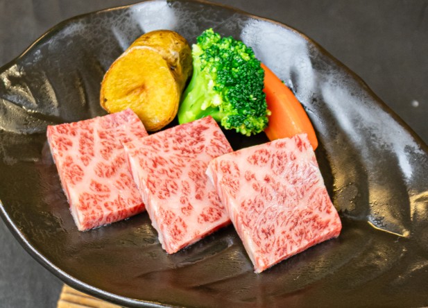 お肉料理は、万葉荘の定番!A5ランクの国産黒毛和牛の陶板焼き。焼き加減はもちろん、岩塩や和風おろしソースなど、