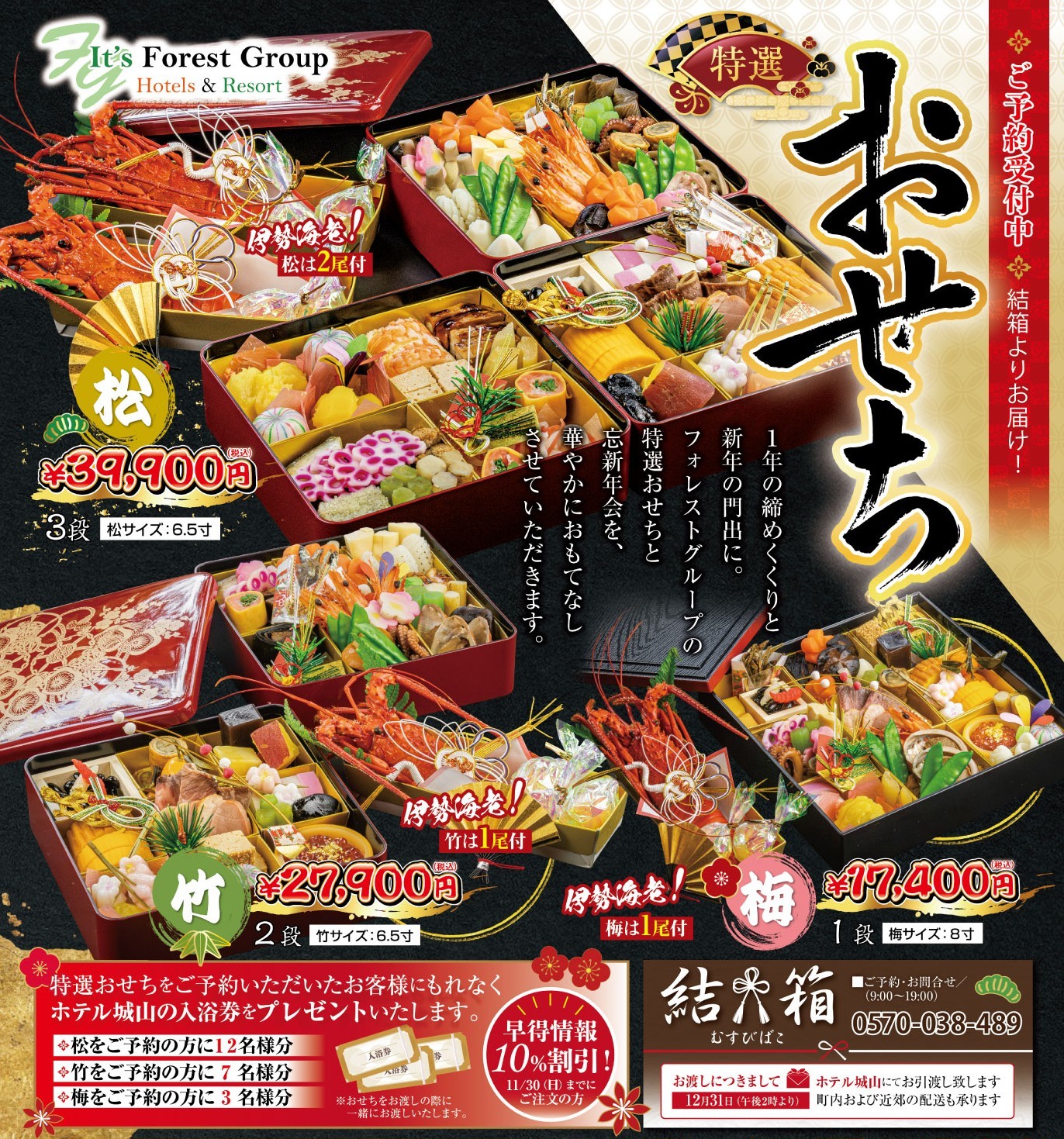 ◆フォレストグループの“特選おせち”は、厳選された高級食材や縁起の良い食材を取り揃え、日本料理の伝統と技を駆使し、素材の味を最大限に引き出したお料理です。迎春にふさわしい極上のおせちは、見た目も豪華で、色合いも美しく、ご満足いただける内容となっております。また11月30日(土)までにご注文いただいた方には「早得10%割引」に加え、ホテル城山の入浴券ももれなくプレゼントいたしますので、お早めにご注文ください。